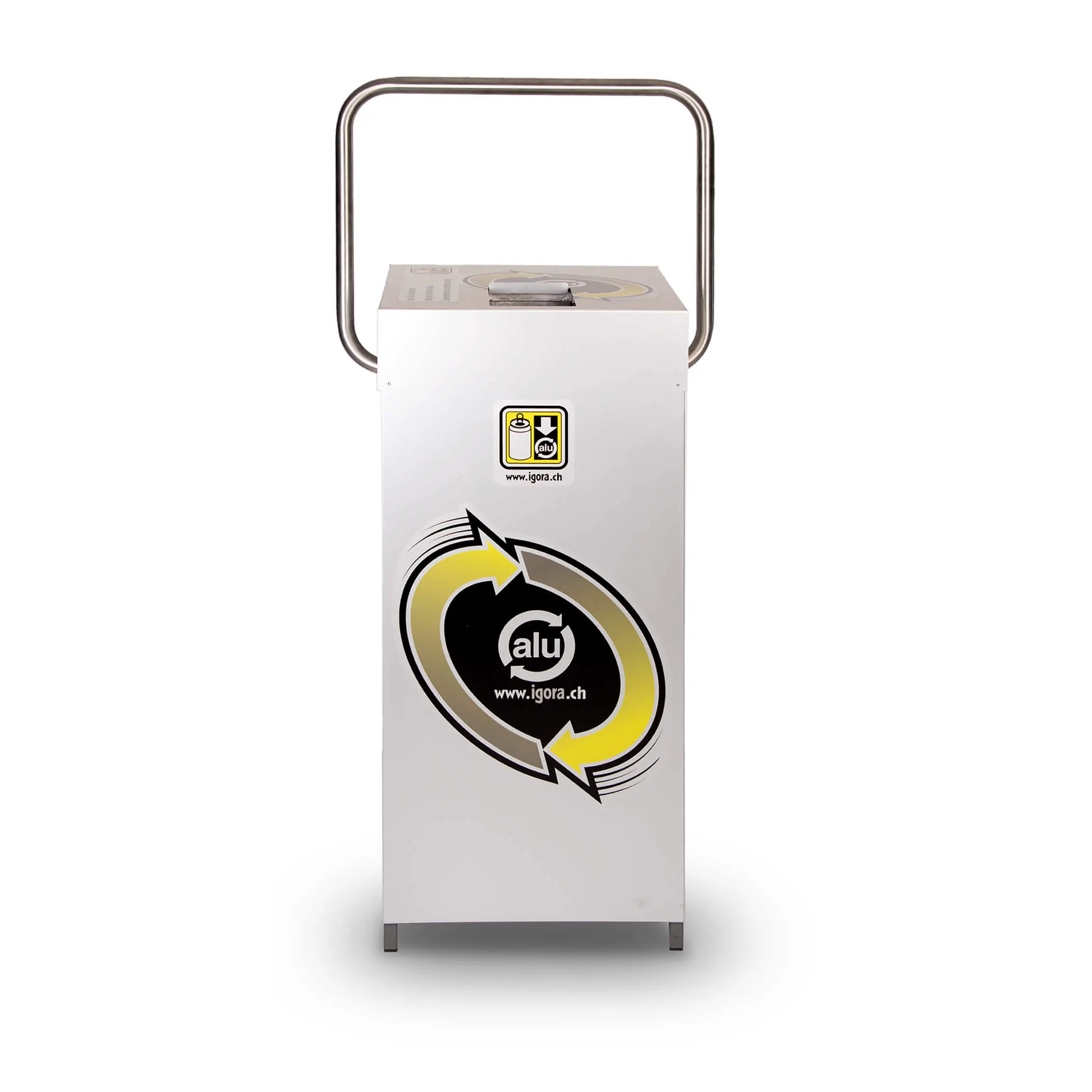 Die Dosenpresse, Modell EcoCube presst 2 Alu-Getränkedosen gleichzeitig, ist sehr standfest, eignet sich für innen und aussen und hat ein Sammelvolumen von 800 Alu-Getränkedosen.