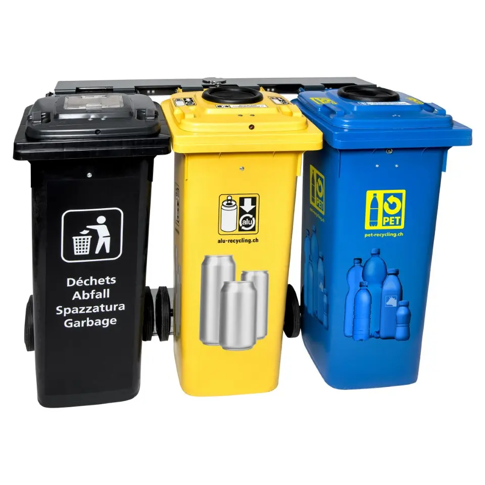 1x horizontale Metallstruktur, 3x 110-Liter Kunststoffbehälter (1x PET, 1x Alu, 1x Abfall), je 10 PET- und Alu-Sammelsäcke. Die Recyclingstation wird auf 2 Paletten druch PET-Recycling Schweiz geliefert.
